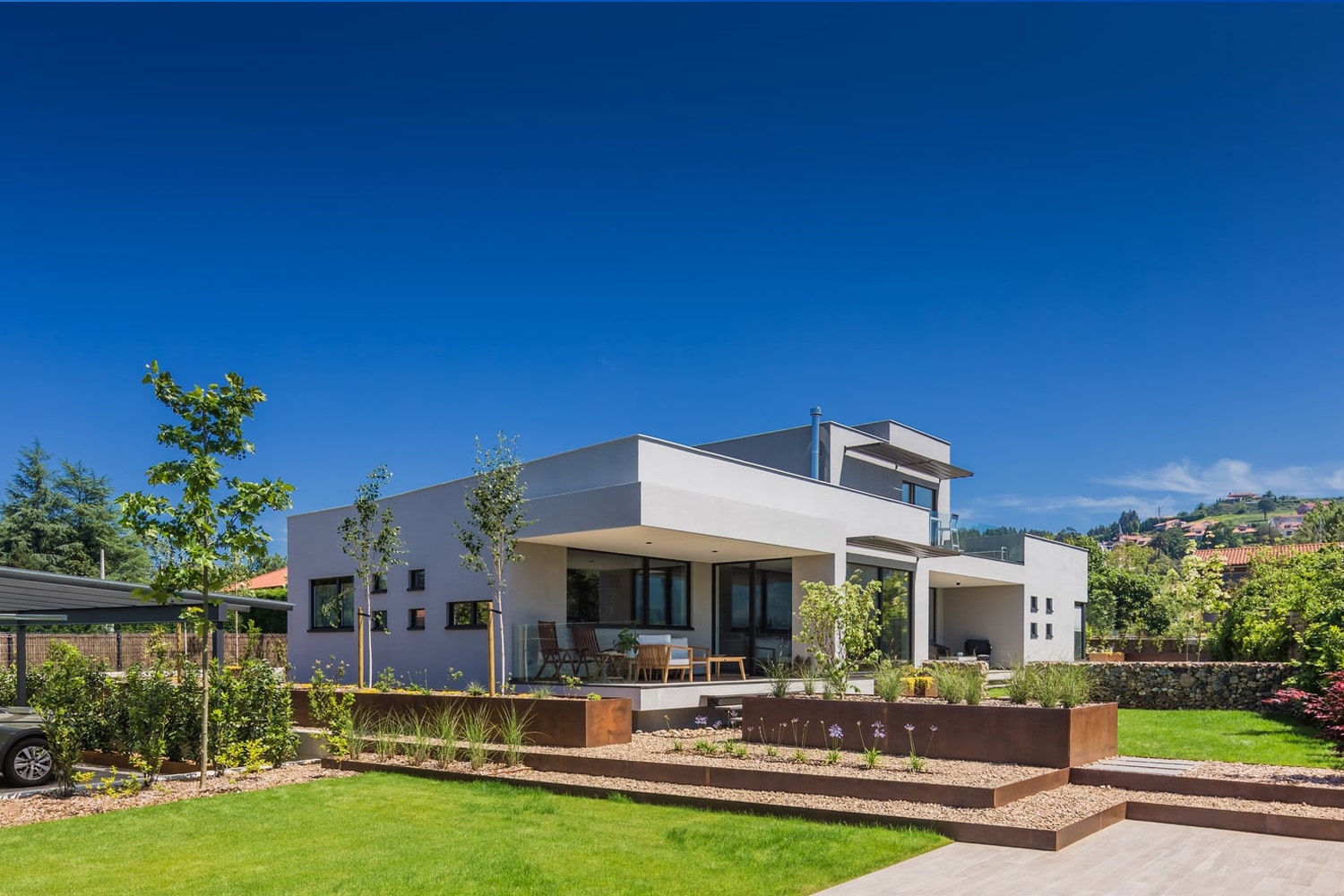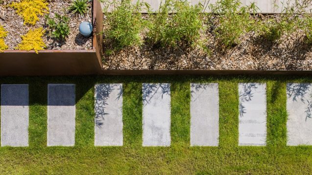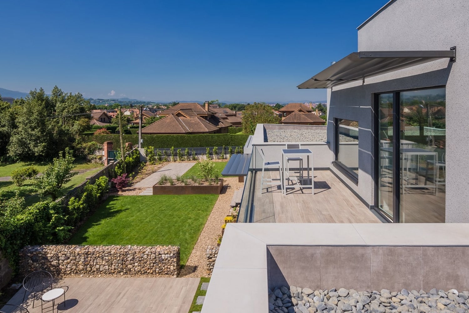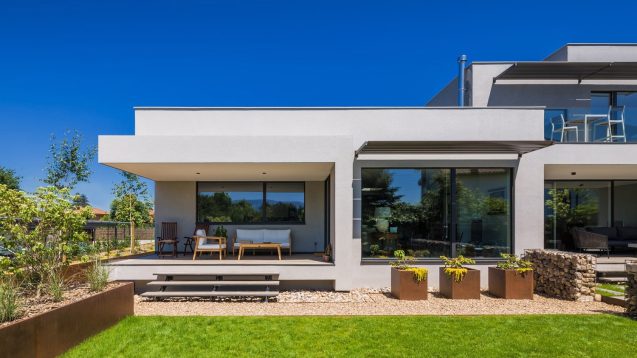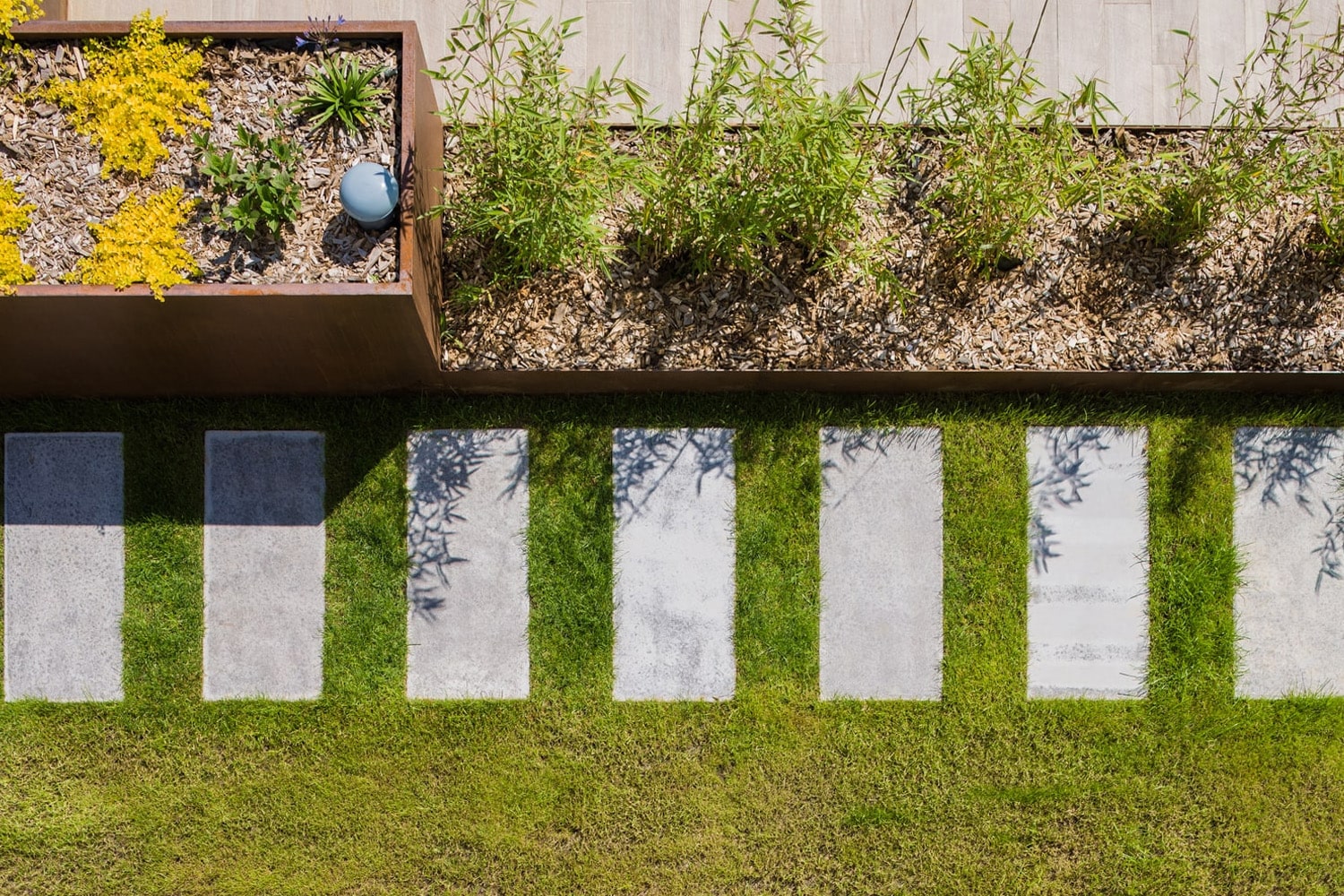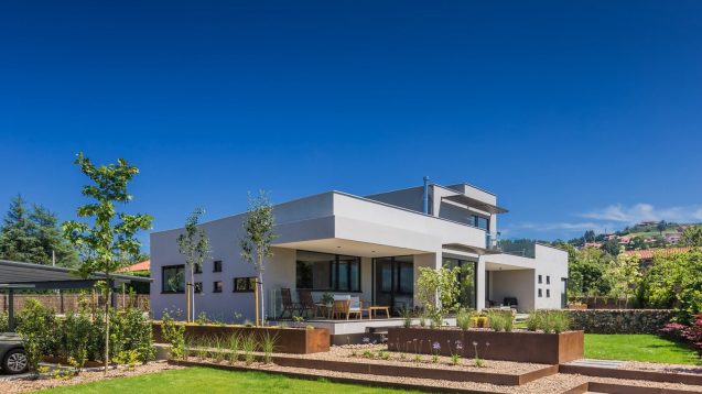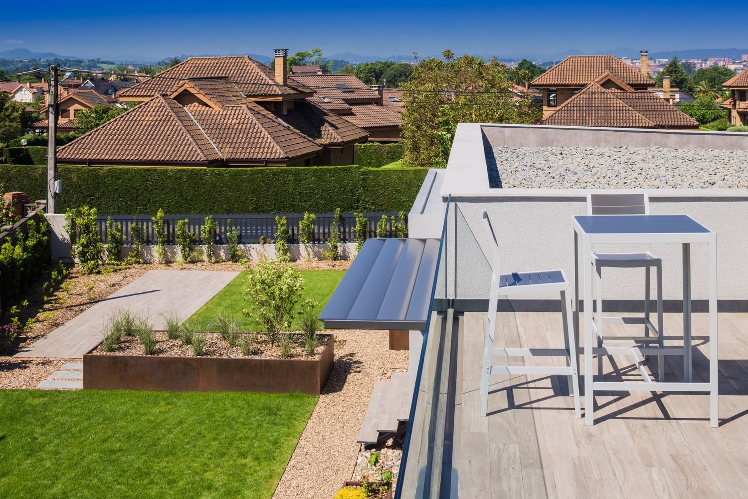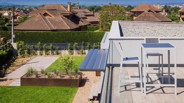 Las líneas definidas y limpios volúmenes de esta vivienda de cubierta plana, se integran a la perfección con el exquisito diseño del jardín y su juego de materiales y niveles.