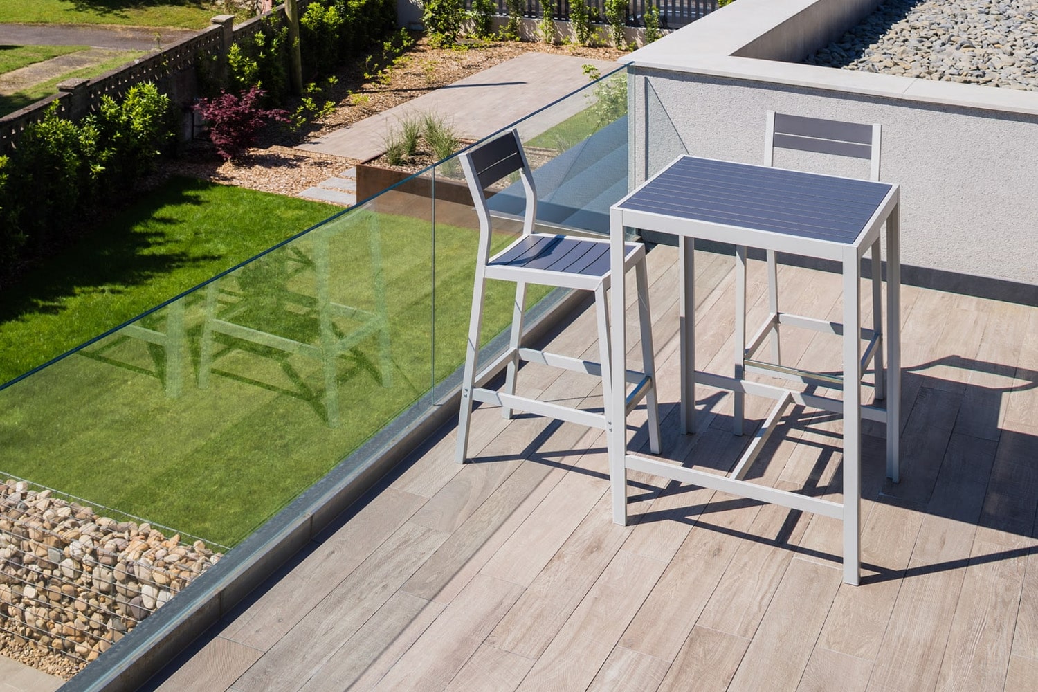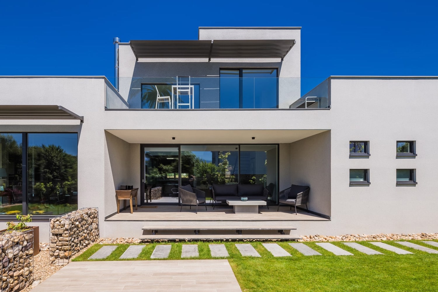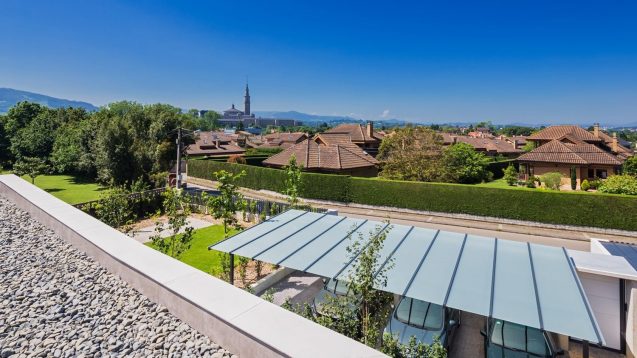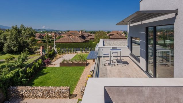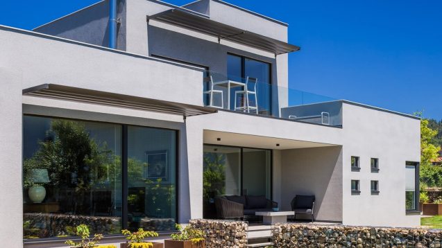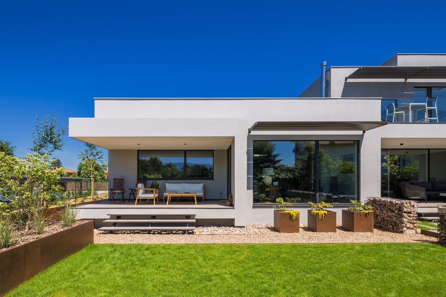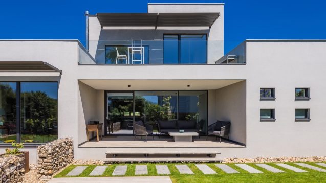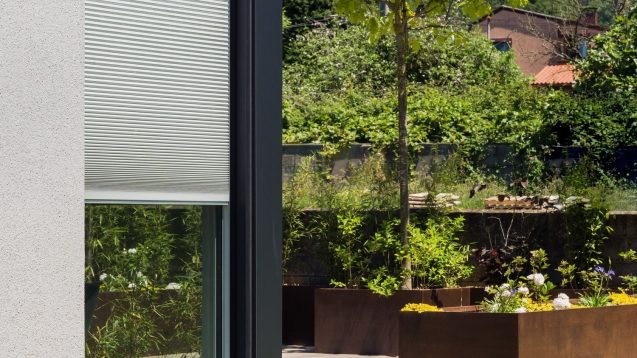Las líneas definidas y limpios volúmenes de esta vivienda de cubierta plana, se integran a la perfección con el exquisito diseño del jardín y su juego de materiales y niveles.