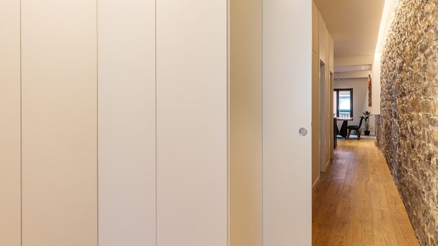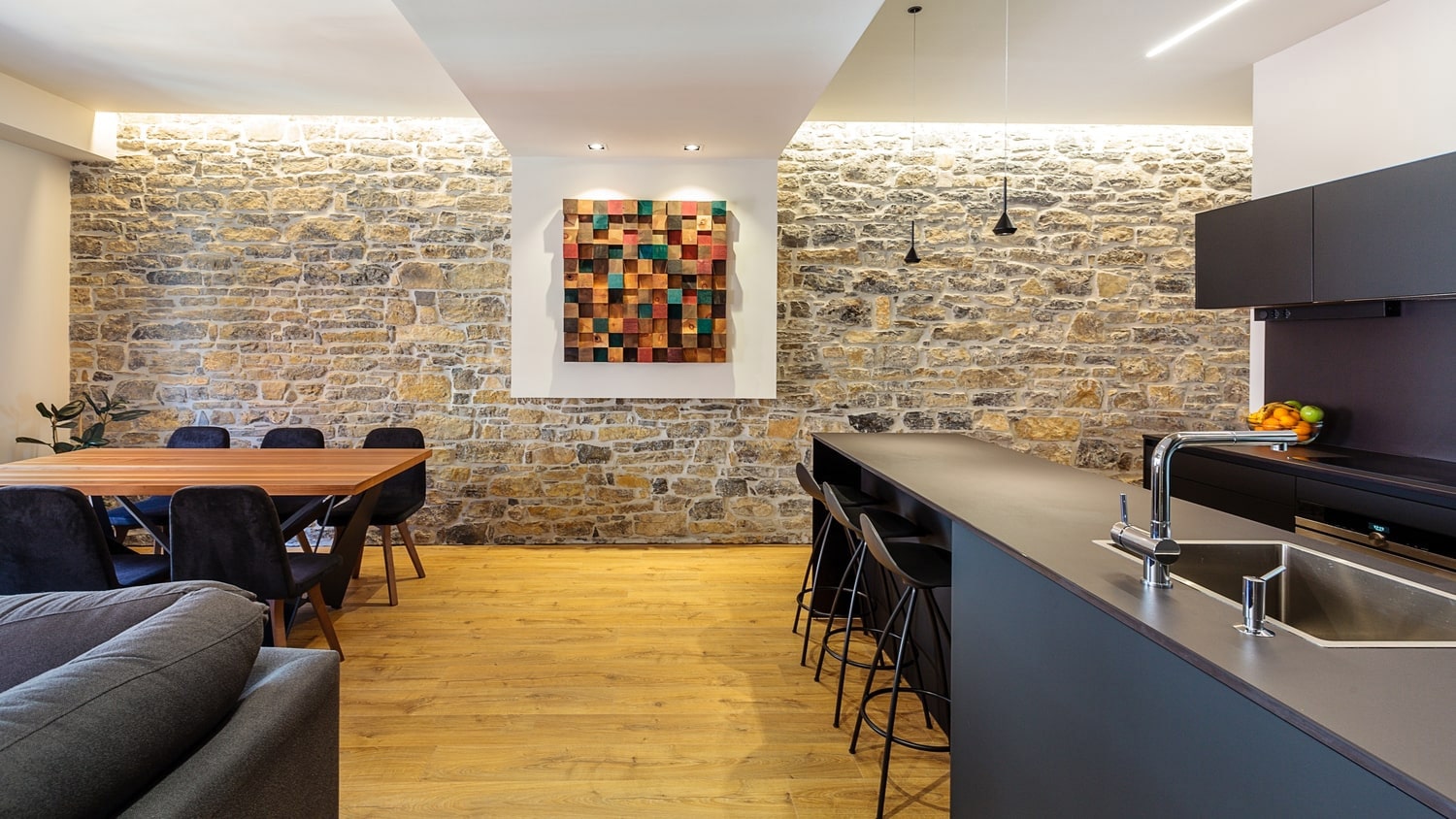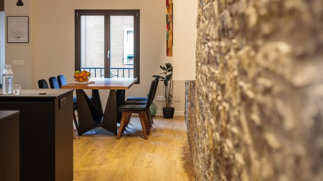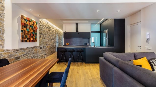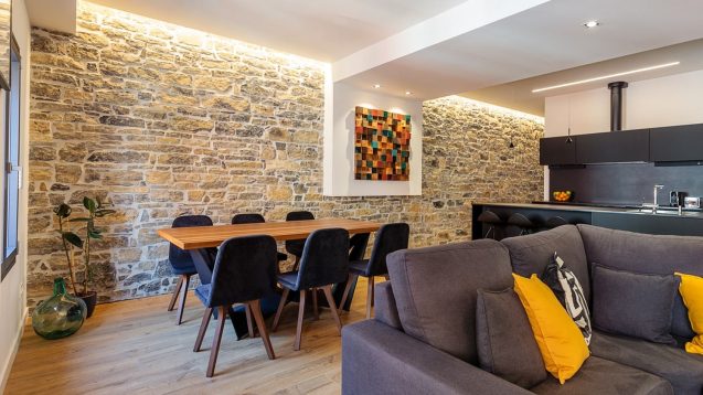 El muro de piedra original de la vivienda aporta una gran personalidad y contrasta con las líneas rectas y limpias de la nueva distribución.